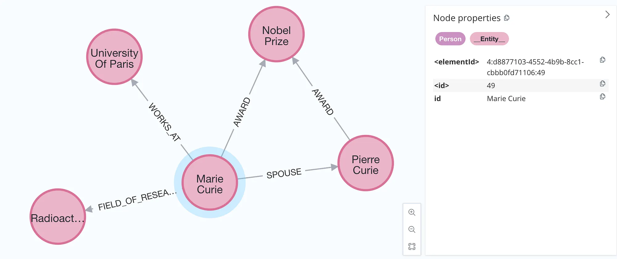 노드와 관계가 모두 정의되면 출력 결과가 훨씬 더 일관된다. 예를 들어, Marie는 항상 상을 수상하고, Pierre의 배우자이며, 파리 대학교에서 근무하는 것으로 나타난다. 다만, 관계가 연결할 수 있는 노드에 대한 제한 없이 일반 목록으로 지정되었기 때문에 여전히 변동이 발생한다. 예를 들어, FIELD_OF_RESEARCH 관계가 Person과 ResearchField 사이에 나타날 수도 있지만, 때로는 Award와 ResearchField를 연결하기도 한다. 또한 관계 방향이 정의되지 않았기 때문에 방향 일관성에 차이가 있을 수 있다.
